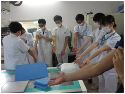 「手関節側面 肘関節側面 膝関節側面 足関節側面のX線撮影法」の話を一般撮影室にプロジェクターをセッティングし、壁に画像を投影して座学とハンズオンを同時進する形で行いました。